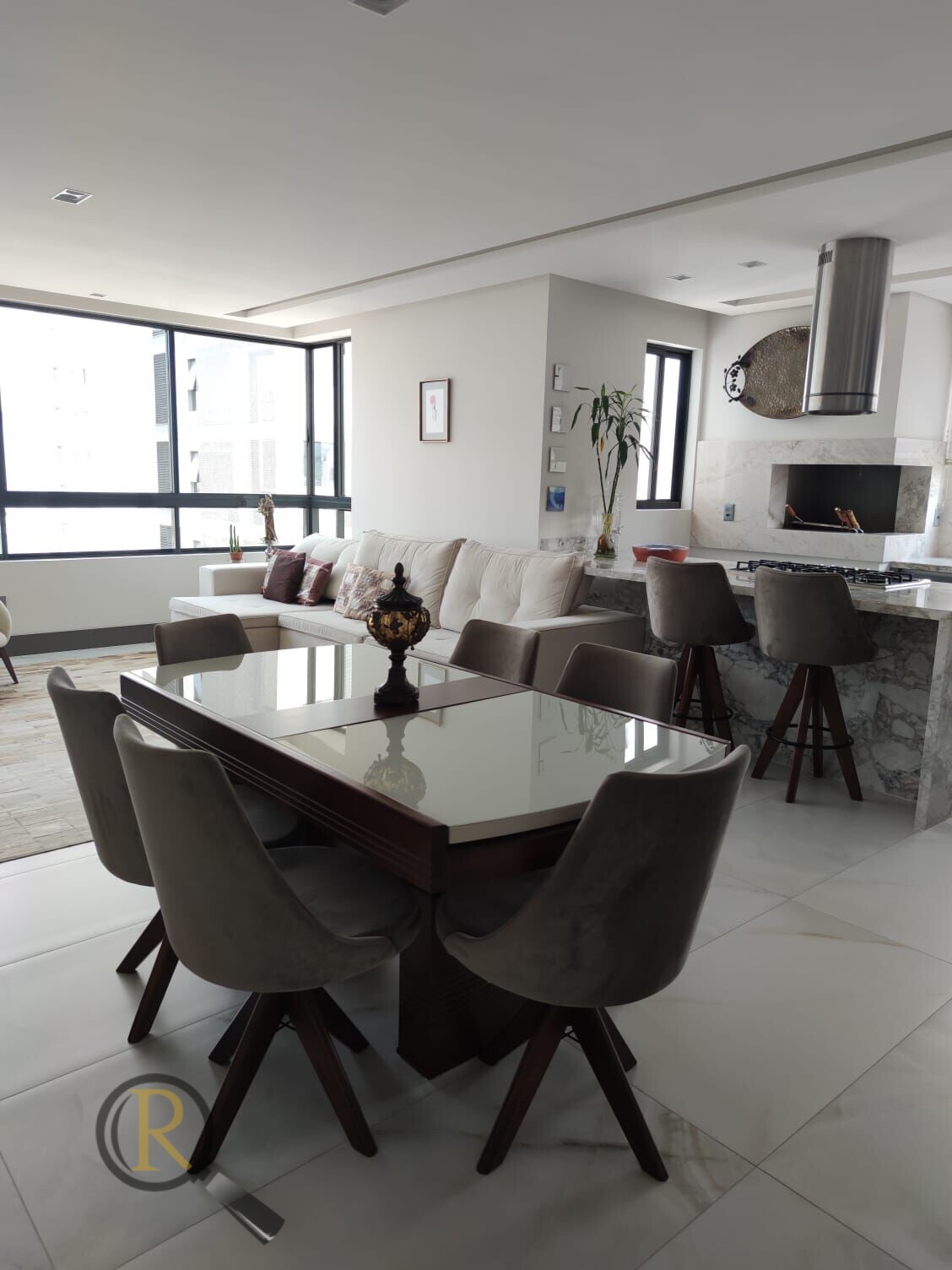 ⏩ Amplo living com cozinha integrada e churrasqueira a carvão
